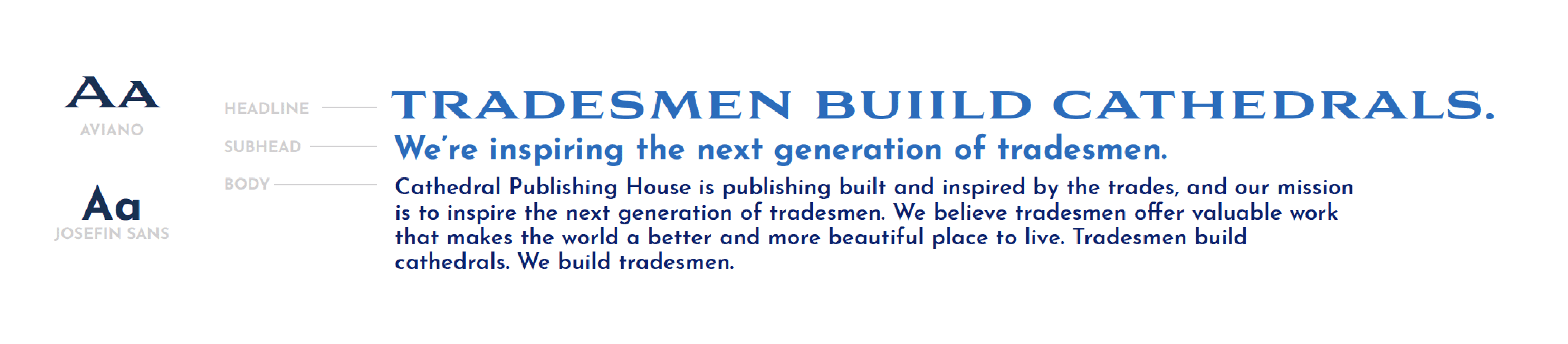 The color palette we selected for Cathedral Publishing House is a monochromatic color scheme, inspired by blue denim jeans, and honest, blue collar work. Blue feels trustworthy, friendly, honest, and strong, which makes this color palette perfect for a publishing house intending to inspire the next generation of tradesmen.