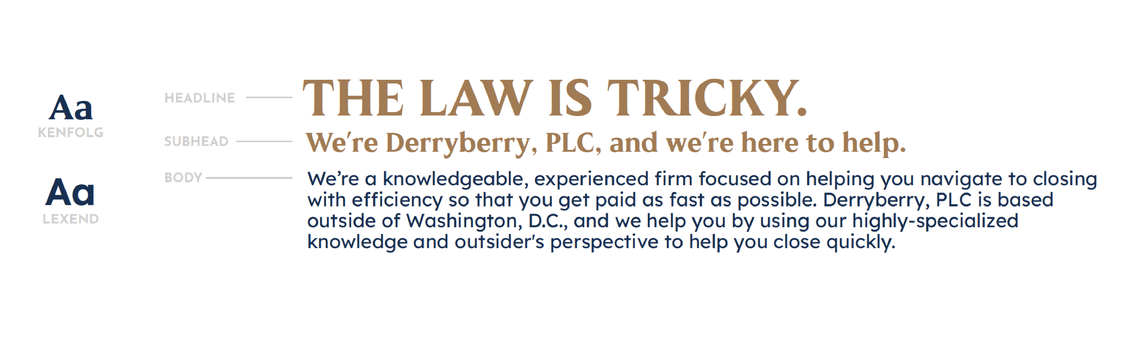 Similarly, we selected Kenfolg as a primary font (for headings and subheadings) because it positions Derryberry as professional, knowledgeable, confident, and premium. Lexend works well as a secondary font because it feels timelessly up-to-date and is easy-to-read.
