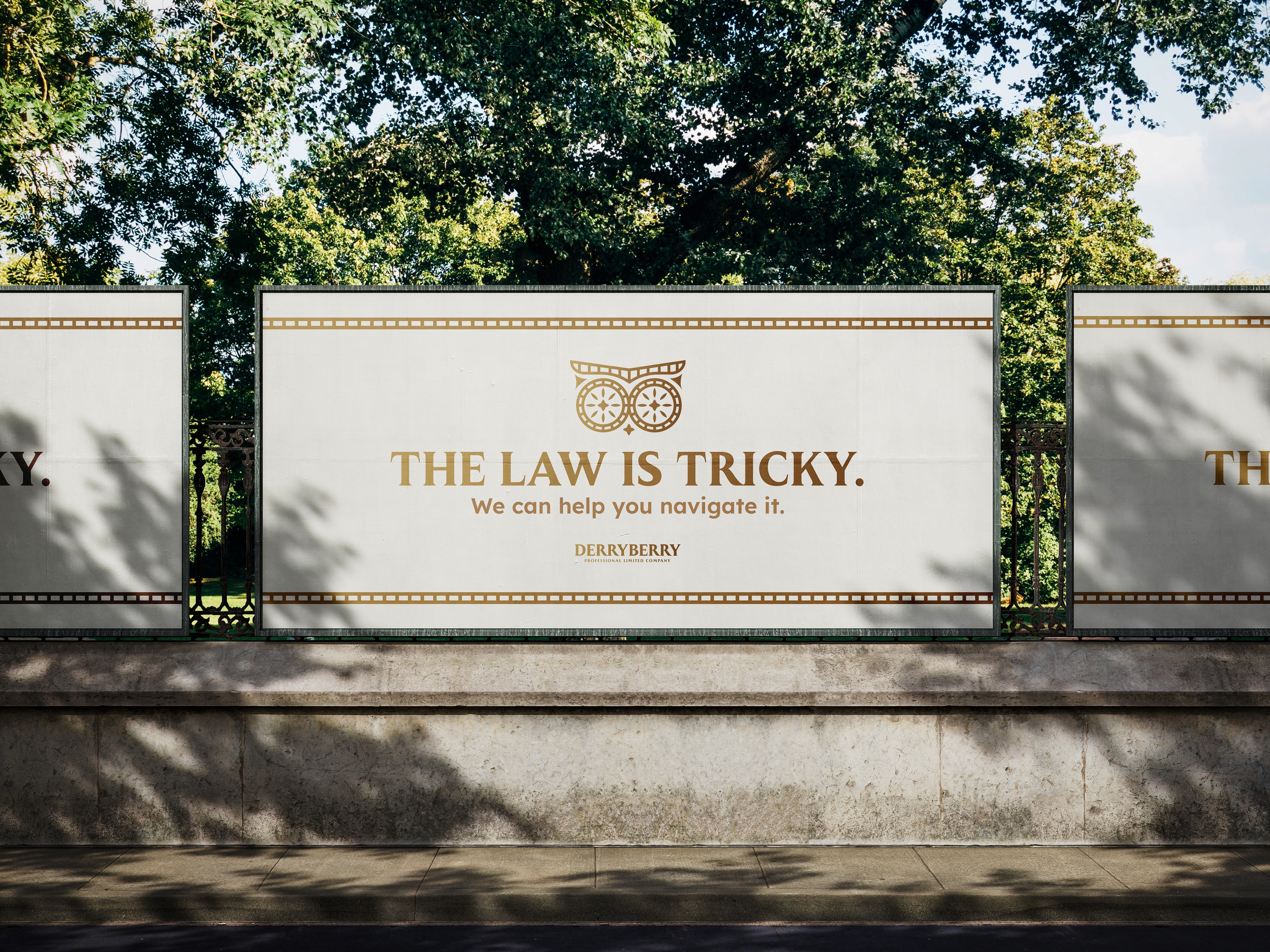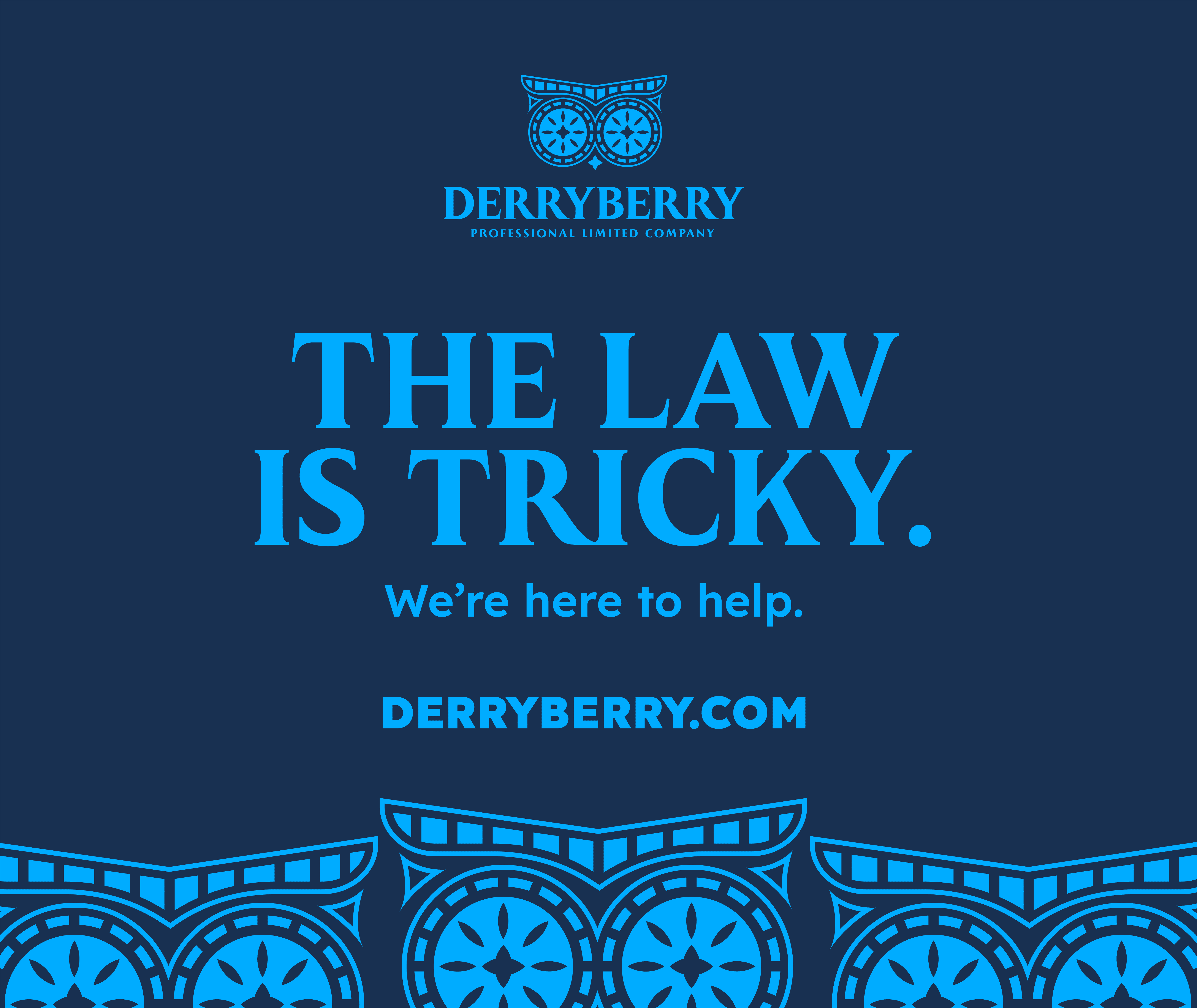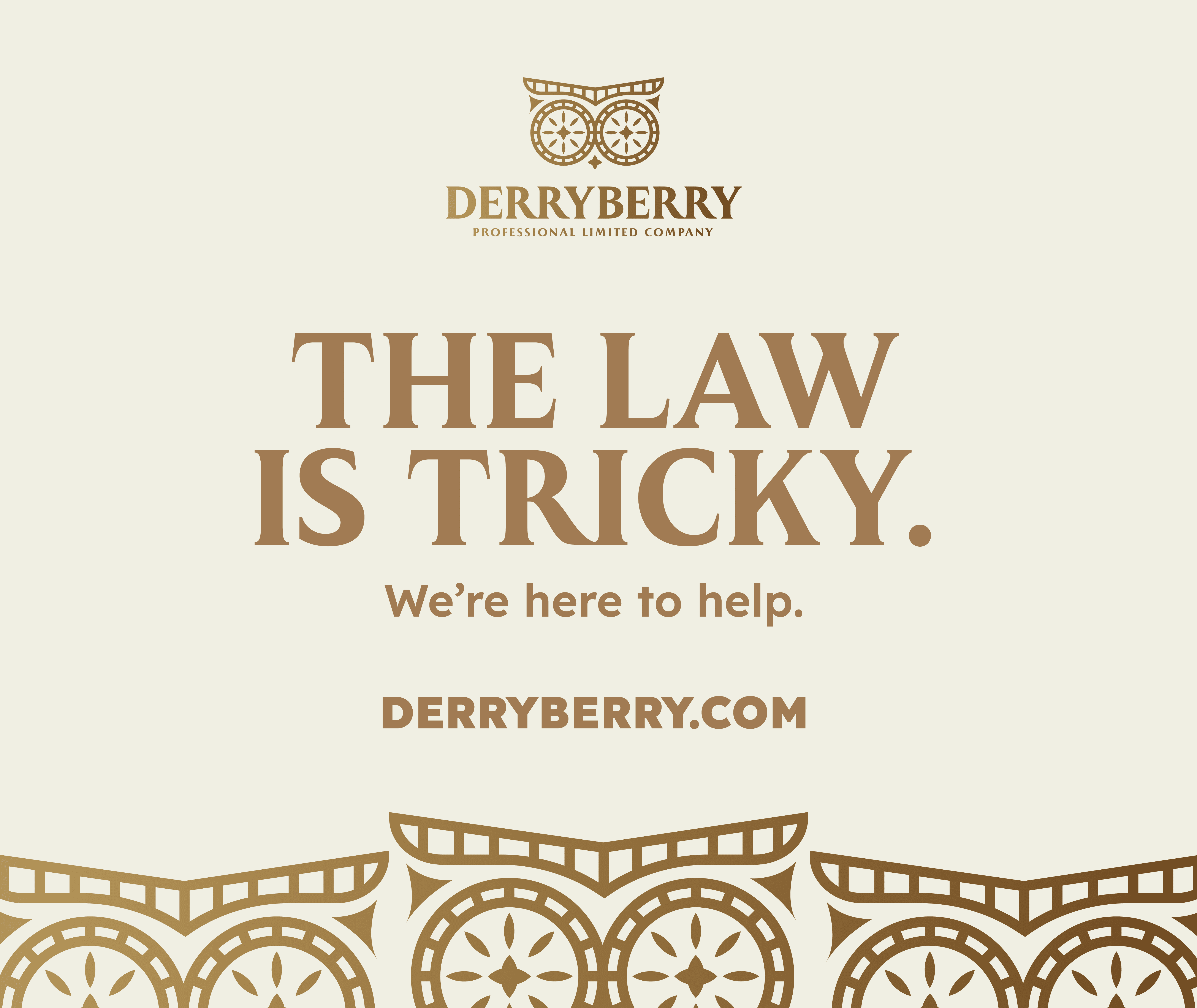 To double down on this evocative imagery, the eyes also resemble two compasses, placed side-by-side. The result is a submark that stands out as visually distinctive, classy, and symbolic of wisdom and Derryberry’s commitment to navigate their clients through the complexities of the law.