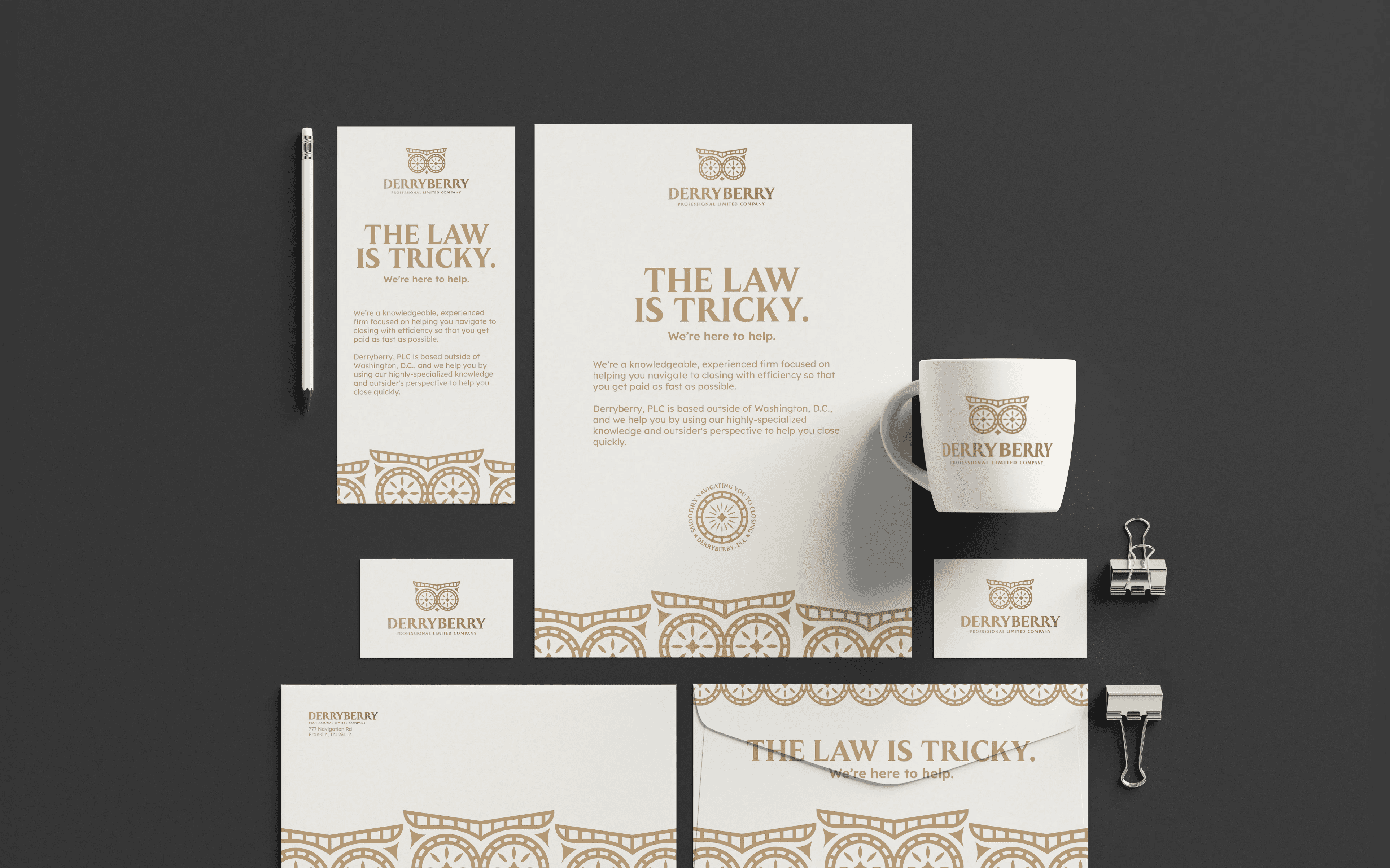 This logo suite positions Derryberry as a wise and caring guide through the complexities of the law. The owl, in classical tradition, was symbolic of the Goddess of Wisdom, Athena, and of wisdom and knowledge generally. With that in mind, we designed the brandmark as the profile of an owl in a simple, elegant, and classy style. Within its two eyes are reflections of the North Star, which was used by the ancients to navigate the treacherous oceans of the world before.