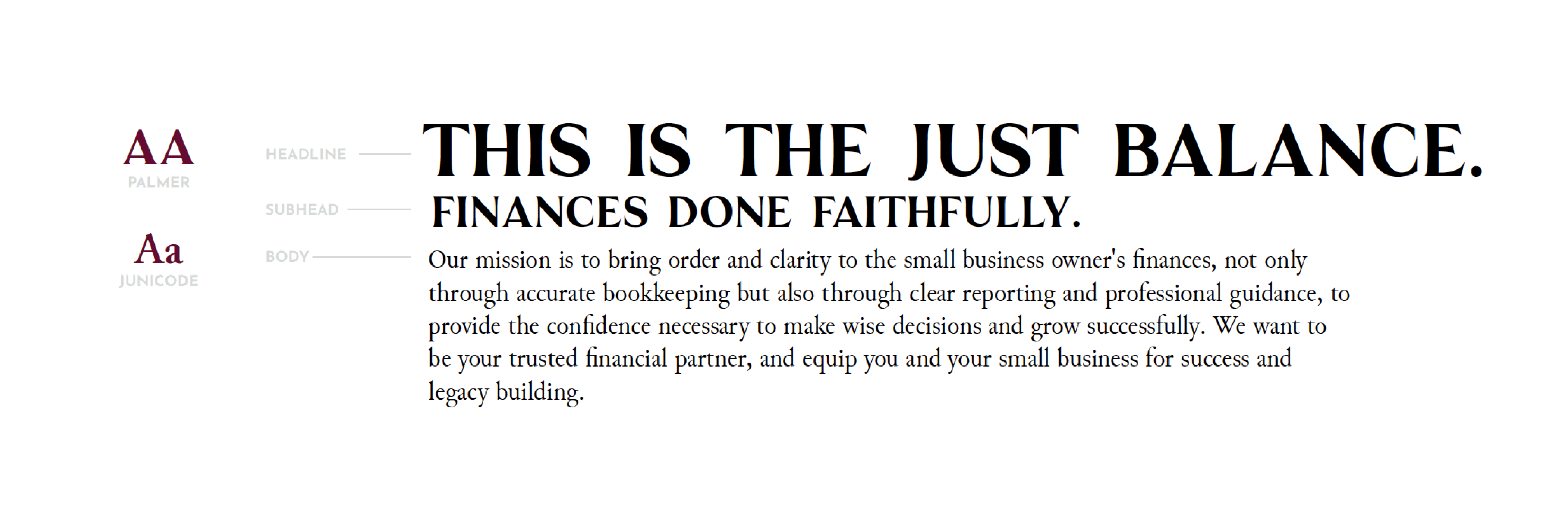 This color palette was designed to make the Just Balance feel professional, reliable, dignified, competent, and diligent. Navy blue feels strong and professional, and maroon feels regal, rich, and luxurious—which helps people intuit that the Just Balance’s financial services are a good investment with a solid ROI. Gold also feels luxurious and regal, while cream provides a nice, natural contrasting color to all the others.
