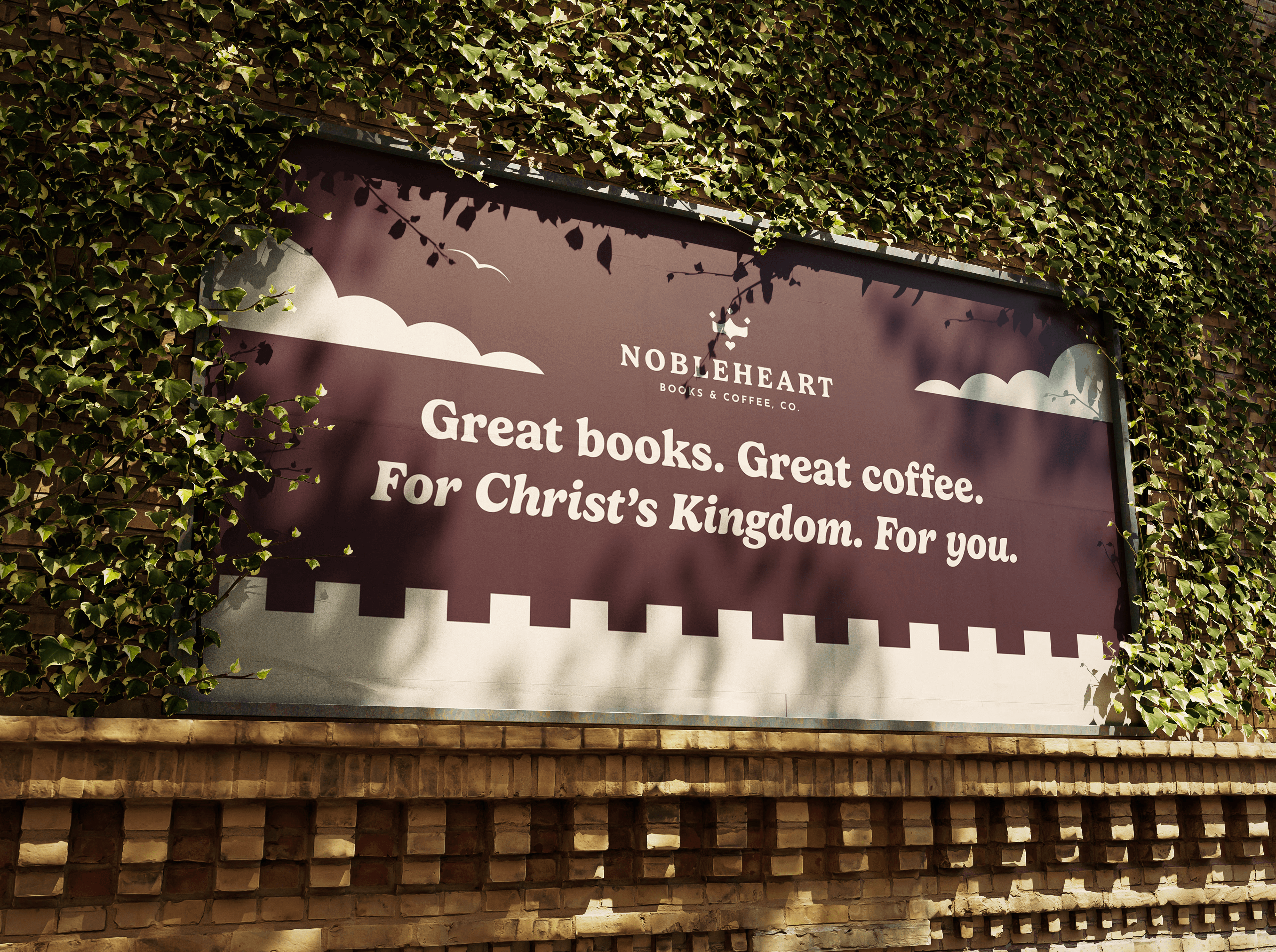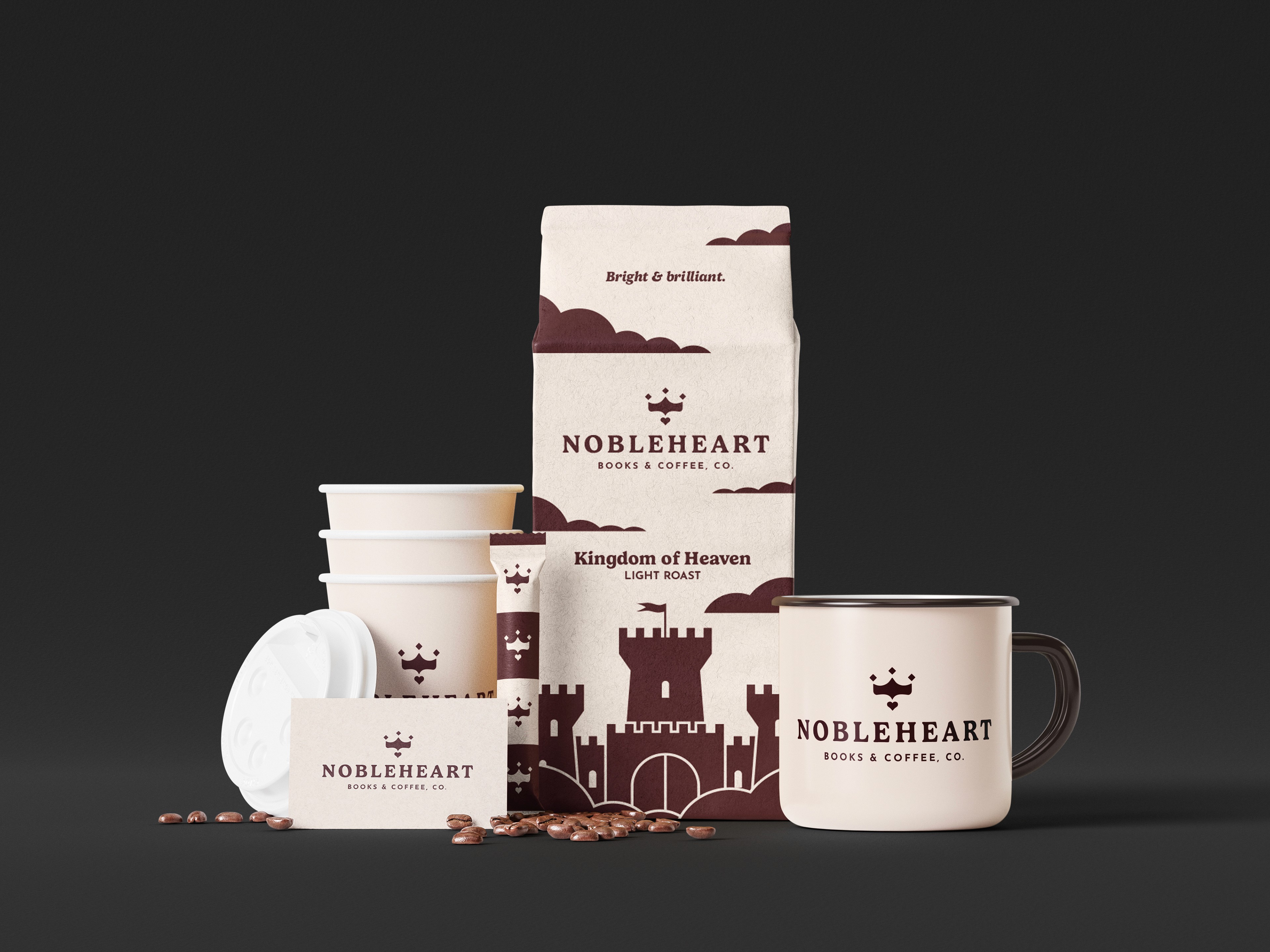 Nobleheart's logo suite positions it as high-class and family-friendly. We designed their brand to feel distinct from all other book and coffee chains so as to put Nobleheart in its own category and make it the only choice for its target audience: Christian parents who want a safe place for them to hangout at with their kids and enjoy good books and great coffee.