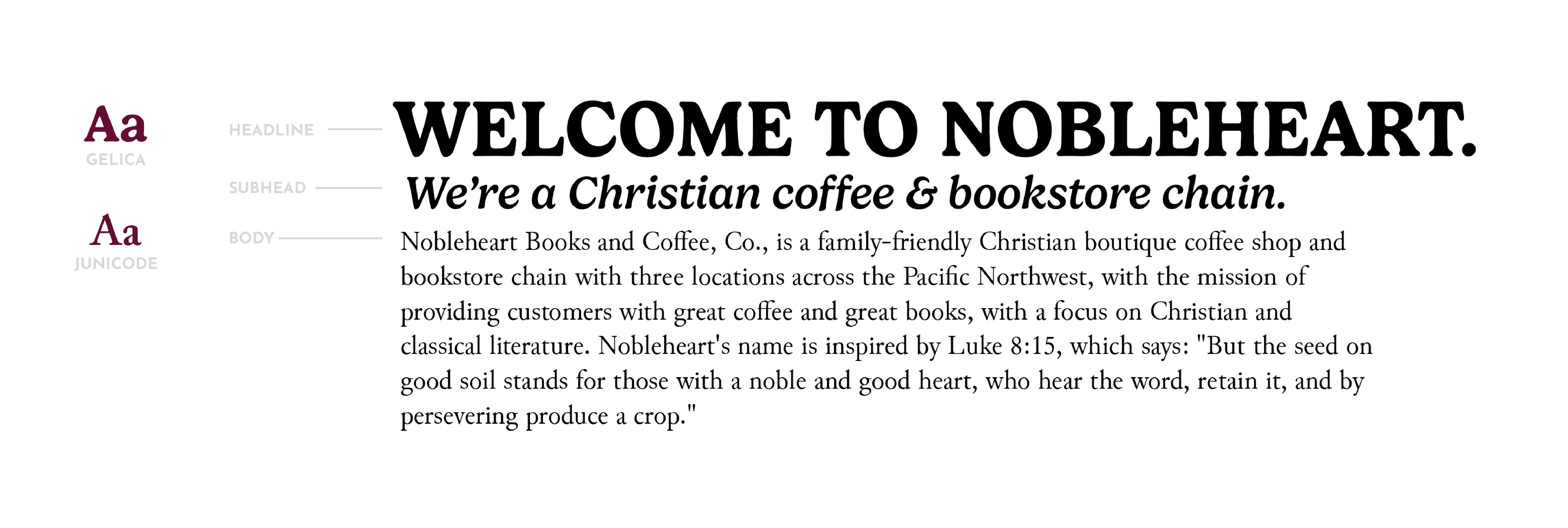 Nobleheart is a family-friendly Christian boutique coffee shop and bookstore chain with three locations across the Pacific Northwest, with the mission of providing customers with great coffee and great books, with a focus on Christian and classical literature.