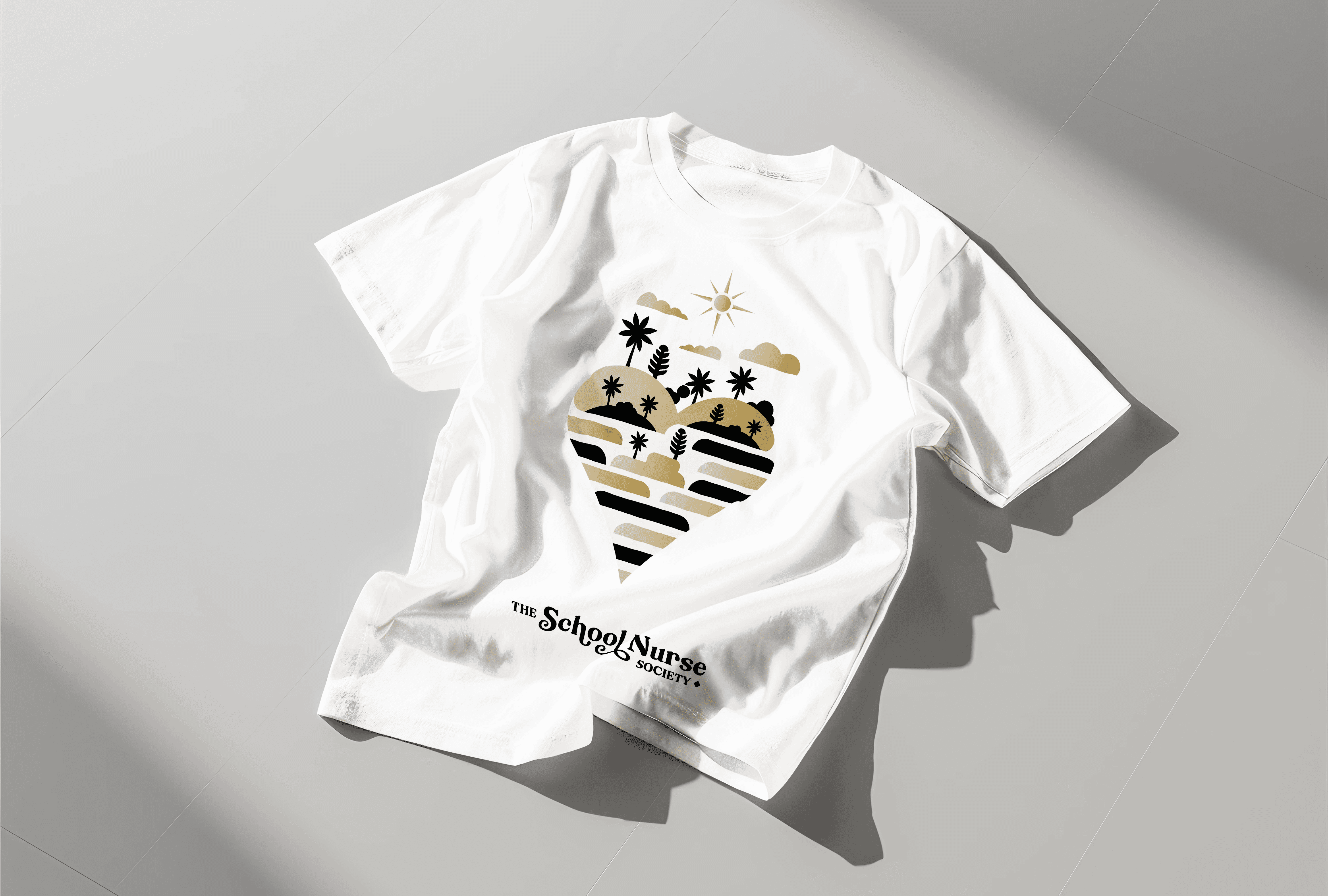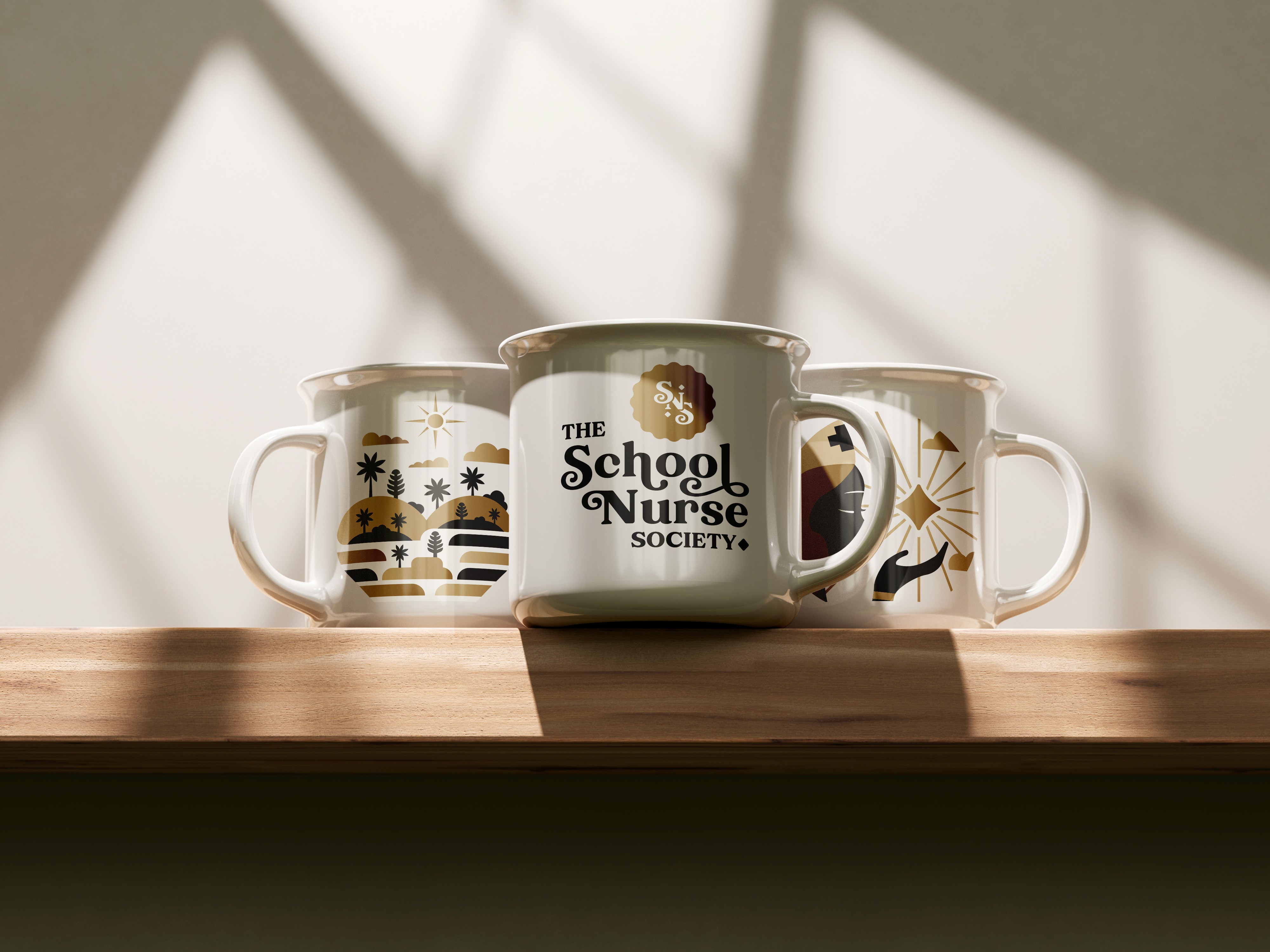 Since the target audience is traveling school nurses, the rising sun was designed to be evocative of a compass. And finally, the negative space that makes up the horizon brings to mind the contours of a book lying open on a table, in reference to how school nurses help the cause of learning at schools across the world.