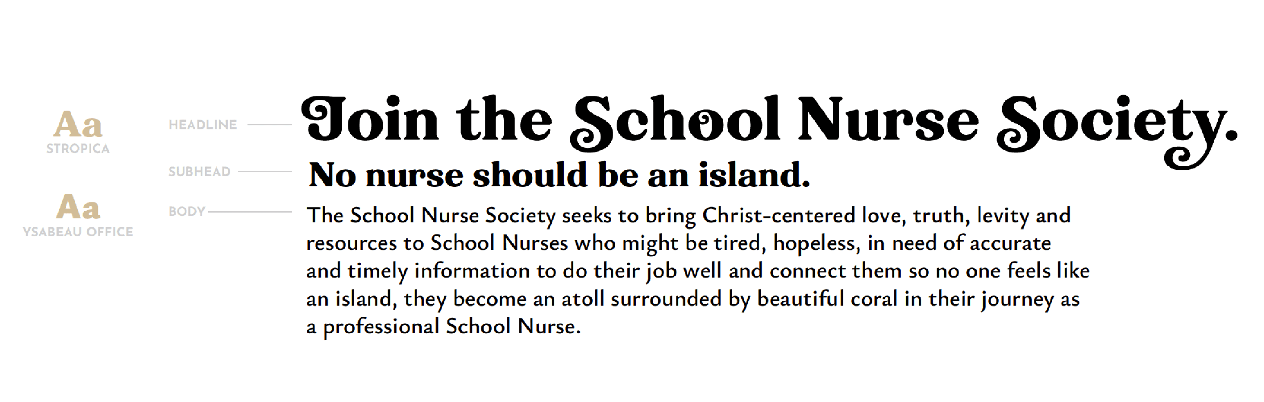 This color palette was selected for its warm, luxurious feel. Terra and Odyssey are combined to create a gradient that’s used extensively for the School Nurse Society’s visual assets, while Ebony and Linen are used for optimal complementarity and contrast.